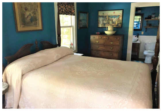 The Elias Carter Suite offers four large windows, a ceiling fan, and seasonal air conditioning along with a Queen sized four poster mahogany bed from a local historic home, and a vintage mahogany twin bed. Furnishings include two Victorian marble top end tables, a mahogany settee, a tiger maple 1820s drop leaf table, and two antique Windsor chairs which surround the fireplace. An 1863 Shaker style coverlet section is framed over the bed. A portrait of Israel Trask hangs over the fireplace mantle. A collection of whimsical Ralph Cahoon prints compliment the soothing blue walls. An antique traveling military campaign chest provides storage as well as a private closet. Recently updated private bath and shower.